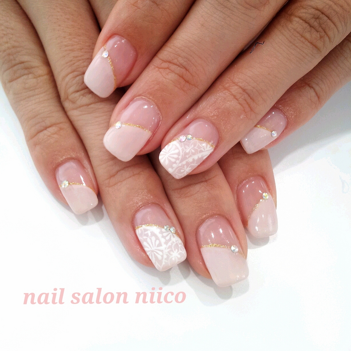 最近人気の手書きデザインご紹介します♪ 逆フレンチベースにレース柄。 ナチュラルカラーにピッタリです♪ ナチュラルピンクとベージュの組み合わせ、さりげない2色使いがキレイ目にまとめてくれています(^-^) こちらは丸いカーブのフレンチにレース柄♪ ベースデザインが変わると雰囲気もまた違ってステキ ですね☆.。.:*・゚ 夏にブルー系カラーでやっても可愛いく仕上がりそうなデザイン♪ お客様にオススメしちゃいそうです (?´ε`?)?