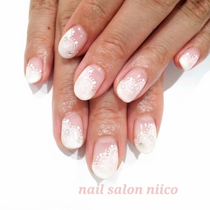 バースデー仕様のネイルにされたH様 以前からずっとやりたいと思っていたという”手描きレース” フレンチスタイルと合わせたデザインにされました バースデーネイルですが、 ブライダルネイルにもピッタリなデザインでしたので こんなショットでも撮ってみました 乳白色でもこもこフレンチをつくり 手描きでレースデザインをいれました。 清楚な雰囲気がとてもお似合いでした 明日のお誕生日ディスニーで素敵な1日を過ごしてくださいね