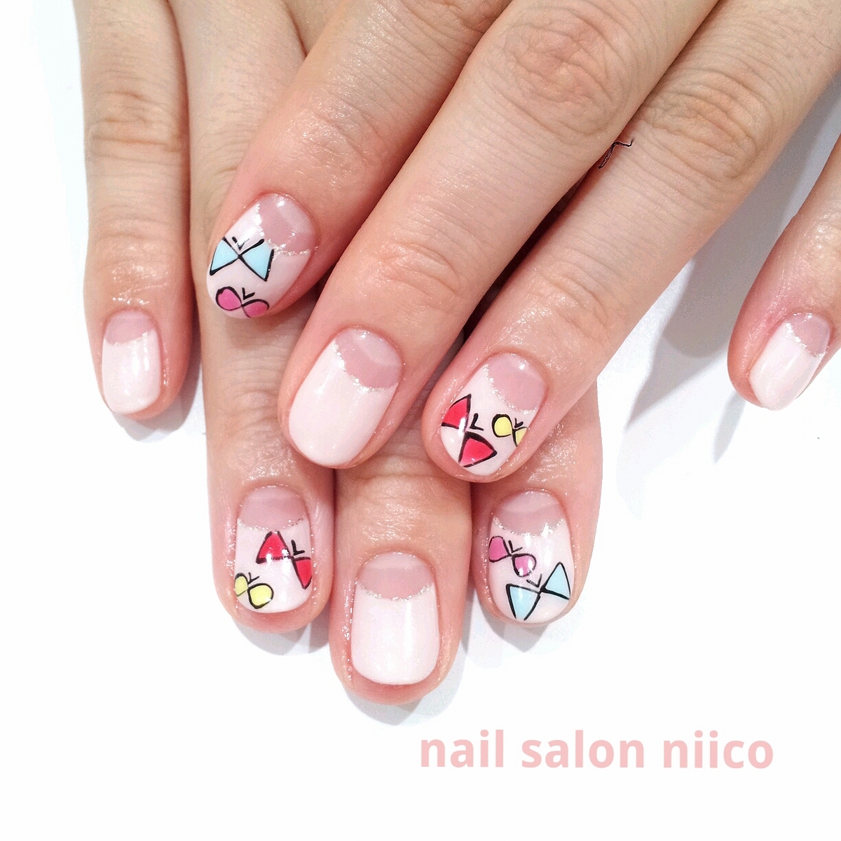 ナチュラルカラーの逆フレンチに手書きのリボン風チョウチョ♪ カラフルカラーが可愛く仕上がっています。 お客様の雰囲気にもピッタリでした(^-^)