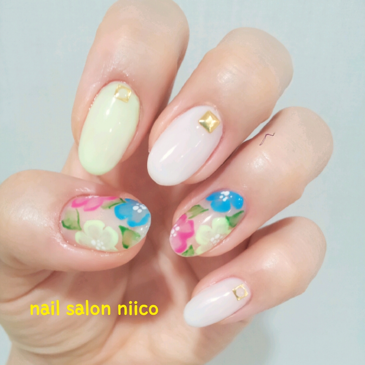 こんにちは(^-^)/ 先日、ネイルチェンジしました☆ こちら☆ カラフルフラワーと、白・パステルネオンを組み合わせました! 少し透け感のあるカラーが優しい雰囲気にしてくれます ( ? 3?)? 夏らしいデザインで、とてもお気に入りです ? お客様もおそろいネイルに☆ 逆フレンチに、カラフルフラワー♪ 明るめなピンクとブルーで、こちらも夏らしい仕上がりになりました!