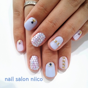 ホロの埋めつくしと、ゴールドのスクエアスタッズとストーンで、ちょっぴりインパクトのあるデザインにしてみました!