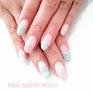 春カラーを使ったバイカラーネイルです 乳白色、ピンク、グリーンの組み合わせが優しい雰囲気です ストーンのお色も、ベースカラーと合わせてオパール系の カラーでまとめています。 バイカラーデザインは、色の組み合わせで 色々な雰囲気を楽しめます 皆様も是非お試しくださいね