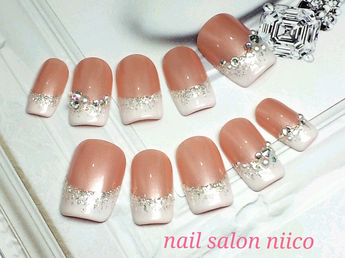 結婚式お呼ばれ用のオーダーチップです 以前はジェルをされていたそうなのですが、 お仕事上できなくなってしまったのだそうです。 せっかくのお呼ばれで、受け付けもされるそうなので ネイルをきちんとしていたい、ということでオーダーチップをお受けしました。 お洋服がまだ決まっていないので、どんな服にも合うように フレンチネイルにされました フレンチラインにはラメのグラデーション、 ストーンはポイント使いで上品に仕上げました 何度も繰り返し使えるオーダーチップは普段ネイルができない方にもオススメです